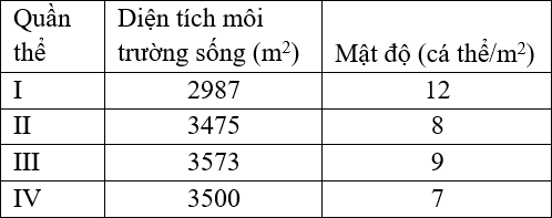 Các quần thể của cùng 1 loài có mật độ và diện tích môi trường sống tương ứng như sau :