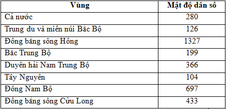 Cho bảng số liệu sau MẬT ĐỘ DÂN SỐ CÁC VÙNG NĂM 2016 Đơn vị: