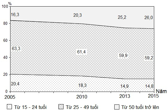 Căn cứ vào biểu đồ, cho biết nhận xét nào sau đây không đúng về sự thay đổi tỉ trọng trong cơ cấu lao động từ 15 tuổi trở lên phân theo nhóm tuổi ở nước ta, giai đoạn 2005 - 2015?