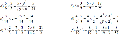 \(\begin{array}{l}a)\;\frac{5}{9} \times \frac{3}{8} & & & b)\;6 \times \frac{3}{7} & & & c)\;\frac{7}{{15}} \times 2\\d)\;\frac{4}{9}:\frac{2}{3} & & & e)\;7:\frac{2}{3} & & & f)\;\frac{8}{{19}}:3\end{array}\)