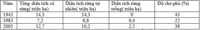 Cho bảng số liệu sau Vẽ biểu đồ thể hiện tổng diện tích rừng và các loại rừng ở