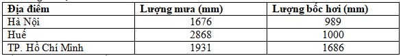Cho bảng số liệu sau: Cân bằng ẩm (mm) của 3 địa điểm trên theo thứ tự