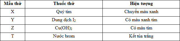 Kết quả thí nghiệm của các dung dịch X, Y, Z, T với thuốc thử được ghi ở bảng sau: Các dung