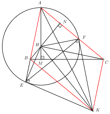 d) Các tiếp tuyến tại E và F của đường tròn \(\left( {H;HA} \right)\) cắt nhau tại K. Chứng minh AK đi qua trung điểm của BC.