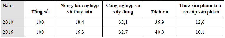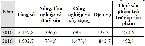 Cho bảng số liệu: Tổng sản phẩm trong nước theo khu vực kinh tế năm 2010 và năm 2016 Đơn vị: