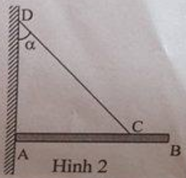 Thanh AB đồng chất, tiết diện đều có khối lượng m1. Thanh được treo bằng sợi dây nhẹ CD, đầu A của thanh tựa trên một bức tường thẳng đứng, AB vuông góc với tường (Hình 2). Biết AC = 3BC, góc \(\alpha ={{45}^{0}}\).
