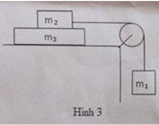 Cho cơ hệ như Hình 3. Ròng rọc có khối lượng không đáng kể, dây nối nhẹ và không dãn, m1 = 2kg, m3 = 1kg; hệ số ma sát trượt giữa m3 và mặt bàn cố định là k = 0,2; hệ số ma sát trượt giữa m2 và m3 là k0 = 0,4; lấy g=10m/s2. Hệ được thả cho chuyển động từ trạng thái nghỉ.