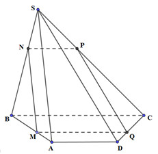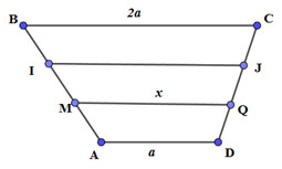 Cho hình chóp \(S.ABCD\) có \(ABCD\) là hình thang, đáy lớn BC với \(BC = 2a,\,\,AD = AB = a\), mặt bên \(\left( {SAD} \right)\)là tam giác đều. Lấy điểm \(M\) trên cạnh AB sao cho \(MB = 2AM\). Mặt phẳng \(\left( \alpha \right)\) đi qua M và song song với SA, BC. Xác định thiết diện của hình chóp bị cắt bởi mặt phẳng \(\left( \alpha \right)\) và tính diện tích của thiết diện đó.