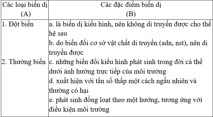Hãy sắp xếp thông tin ở cột A với cột B sao cho phù hợp