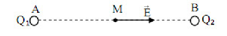Cho hai điện tích Q1 và Q2 với |Q1| = |Q2|, đặt tại hai điểm A và B, là vecto cường độ điện trường tổng hợp do Q1 và Q2 gây ra tại M (M trung điểm AB) như hình vẽ. Ta kết luận