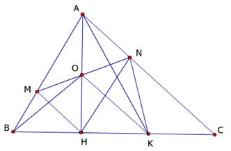 Cho \(\Delta ABC\) vuông tại \(A\) , đường cao \(AH\) . Gọi \(M,\,N\) theo thứ tự là chân các đường vuông góc kẻ từ \(H\) đến \(AB,\,AC\) . Gọi \(O\) là giao điểm của \(AH\) và \(MN\),\(K\) là trung điểm của \(CH\)