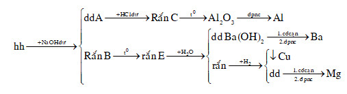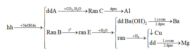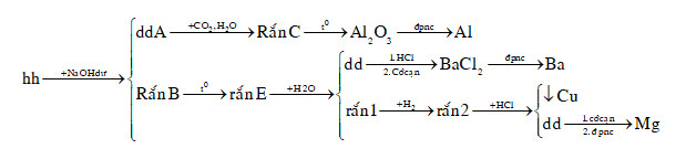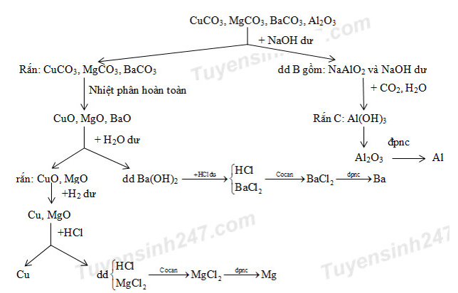 Từ hỗn hợp gồm CuCO3, MgCO3, Al2O3 và BaCO3 hãy điều chế từng kim loại riêng biệt với điều kiện không làm thay đổi khối lượng của từng kim loại trong hỗn hợp. Ta có thể điều chế theo sơ đồ: