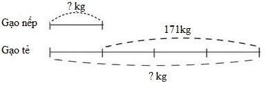 Một cửa hàng có số gạo nếp ít hơn số gạo tẻ là \(171kg\). Tính số gạo mỗi loại, biết số gạo tẻ gấp \(4\) lần số gạo nếp.