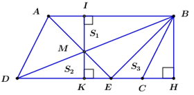 1. Cho hình bình hành \(ABC{\rm{D}}\) , điểm \(E\) nằm giữa hai điểm \(C\) và \(D\) . Gọi \(M\) là giao điểm của \(A{\rm{E}}\) và \(B{\rm{D}}\) . Gọi diện tích \(ABM\) là \({S_1}\) , diện tích\(\Delta MDE\) là \({S_2}\), diện tích \(\Delta BCE\) là \({S_3}\). So sánh \({S_1}\) với \({S_2} + {S_3}.\)