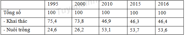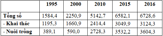 Cho bảng số liệu: Sản lượng thủy sản nước ta giai đoạn 1995 – 2016 (Đơn vị: nghìn