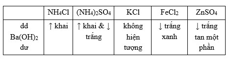 Cho các dung dịch sau mỗi dung dịch đựng trong một lọ mất nhãn: NH4Cl; (NH4)2SO4; KCl; FeCl2; ZnSO4.