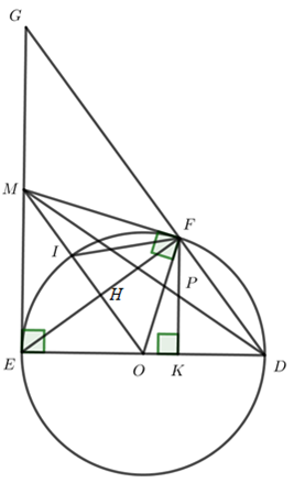 3) Kẻ đường kính ED của \(\left( {O;R} \right)\). Hạ FK vuông góc với ED. Gọi P là giao điểm của MD và FK. Chứng minh P là trung điểm của FK.