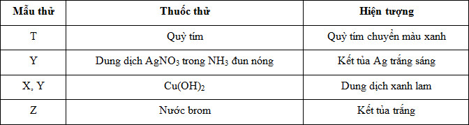 Kết quả thí nghiệm của các dung dịch X, Y, Z, T với thuốc thử được ghi ở bảng sau: