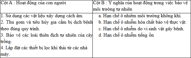 Trong các tổ hợp ghép đôi giữa mỗi hoạt động ở cột A với một ý nghĩa của hoạt động ở cột B sau đây, tổ hợp ghép đôi nào đúng ?