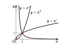 Hình vẽ sau đây là đồ thị của ba hàm số \(y = {x^\alpha };\,\,y = {x^\beta };\,\,y = {x^\gamma }\)
