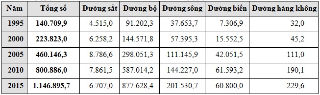Nhận định nào sau đây đúng về khối lượng hàng hóa vận chuyển phân theo loại hình vận tải nước ta giai đoạn 1995 - 2015