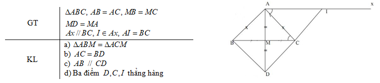 d) Trên nửa mặt phẳng bờ là \(AC\) không chứa điểm \(B\), vẽ tia \(Ax\)//\(BC\), lấy điểm \(I \in Ax\) sao cho \(AI = BC\). Chứng minh \(3\) điểm \(D,\,\,C,\,\,I\) thẳng hàng.