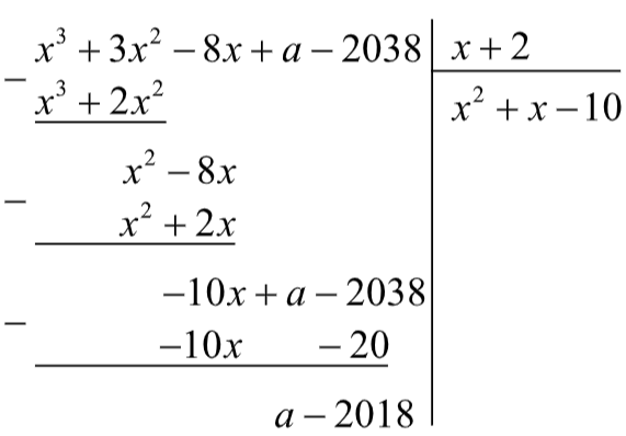 Thực hiện phép chia \(({x^3} + 3{x^2} - 8x + a - 2038):(x + 2)\) để tìm thương và số dư trong phép chia đó.