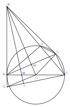 Cho tam giác ABC vuông tại A, đường tròn \(\left( O \right)\)đường kính AC cắt BC tại K, vẽ dây cung AD của \(\left( O \right)\) vuông góc với BO tại H.