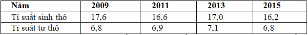 Cho bảng số liệu: TỈ SUẤT SINH THÔ VÀ TỬ SUẤT TỬ THÔ CỦA NƯỚC TA GIAI ĐOẠN 2009-2015 (Đơn