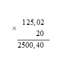 Đặt tính rồi tính: \(125,02 \times 20\)