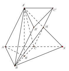 +) Gọi H là trung điểm của BC \( \Rightarrow A'H \bot \left( {ABC} \right)\)