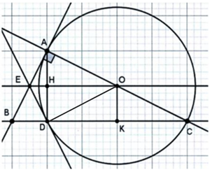 Cho tam giác \(ABC\) vuông tại \(A\,\,(AB < AC)\). Vẽ đường tròn tâm \(O\) đường kính \(AC\) cắt cạnh \(BC\) tại \(D\,\,(D \ne C)\). Gọi \(H\) và \(K\) lần lượt là trung điểm của \(AD\) và \(DC.\) Tia \(OH\) cắt cạnh \(AB\) tại \(E\) . Chứng minh:
