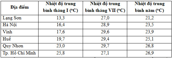 Cho bảng số liệu: NHIỆT ĐỘ TRUNG BÌNH TẠI MỘT SỐ ĐỊA ĐIỂM Theo bảng số liệu trên,