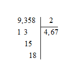 Số dư của phép chia \(9,358:2\), nếu chỉ lấy đến hai chữ số của phần thập phân của thương
