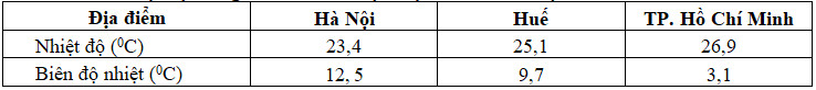Cho bảng số liệu: Nhiệt độ trung bình và biên độ nhiệt năm của ba địa điểm ở nước