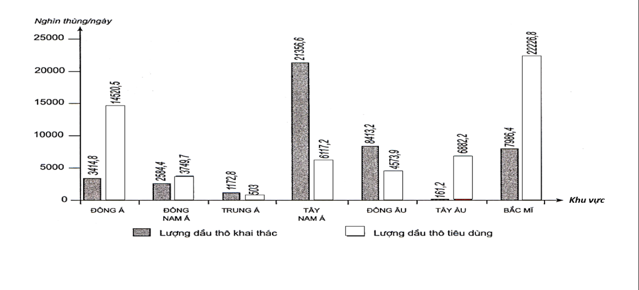 Cho biểu đồ về dầu thô ở một số khu vực của thế giới năm 2003: