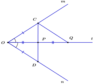 Cho góc nhọn mOn, Ot là tia phân giác của góc mOn. Trên tia Om và On lần lượt lấy hai điểm C và D sao cho OC = OD. Đoạn thẳng CD cắt Ot tại P.