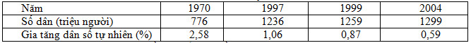 Cho bảng số liệu SỐ DÂN VÀ SỰ GIA TĂNG DÂN SỐ TRUNG QUỐC THỜI KÌ 1970 – 2004