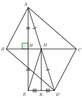 b) Vẽ AH vuông góc với BC tại H. Trên tia đối của tia HA lấy điểm E sao cho \(HE = HA\). Chứng minh \(\Delta HMA = \Delta HME\) và suy ra \(ME = MD\).