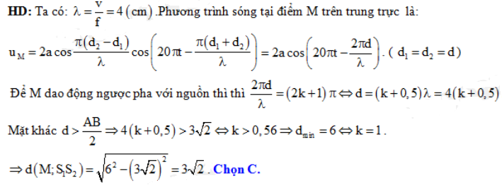 Trên mặt nước có hai nguồn kết hợp S1, S2 cách nhau 6\(\sqrt 2 \) cm dao động theo phương trình \(u = a\cos 20\pi t\)(mm).Tốc độ truyền sóng trên mặt nước là 0,4 m/s và biên độ sóng không đổi trong quá trình truyền.Điểm gần nhất ngược pha với các nguồn nằm trên đường trung trực của S1S2 cách S1S2 một đoạn: