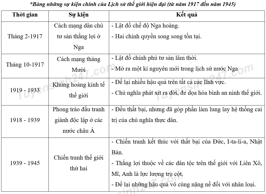 Lập bảng những sự kiện chính của Lịch sử thế giới hiện đại (từ năm 1917 đến năm