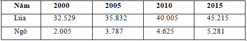Cho bảng số liệu: Sản lượng lúa và ngô của nước ta giai đoạn 2000-2015 (Đơn vị: nghìn