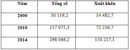 Cho bảng số liệu: Tổng kim ngạch và kim ngạch xuất khẩu nước ta giai đoạn 2000 - 2014 (Đơn