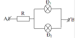 Cho mạch điện có sơ đồ hình vẽ. Biết R = 10Ω, đèn 1 ghi 12V – 12W. đèn 2 ghi 12V – 6W, UAB =