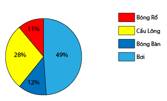 Biểu đồ hình quạt sau đây cho biết tỉ số phần trăm học sinh tham gia các môn thể thao của