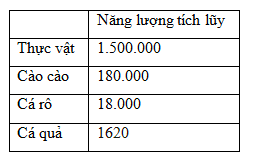 Giả sử một hệ sinh thái đồng ruộng, cào cào sử dụng thực vật làm thức ăn; cào cào là thức ăn của cá rô; cá quả sử dụng cá rô làm thức ăn. Cá quả tích lũy được 1620 kcal, tương đương với 9% năng lượng tích lũy ở bậc dinh dưỡng liên kề với nó. Cá rô tích lũy được năng lượng tương đương với 10% năng lượng ở cào cào. Thực vật tích lũy được 1500000 kcal. Hiệu suất sinh thái giữa bậc dinh dưỡng cấp 2 với bậc dinh dưỡng cấp 1 là