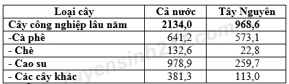 Cho bảng số liệu sau: Diện tích gieo trồng cây công nghiệp lâu năm của cả nước và Tây Nguyên