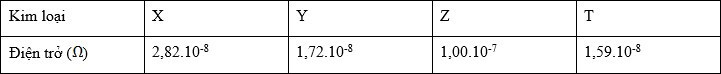 Điện trở đặc trưng cho khả năng cản trở dòng điện. Điện trở càng lớn thì khả năng dẫn điện của kim loại càng giảm. Cho 4 kim loại X, Y, Z, T ngẫu nhiên tương ứng với Ag, Al, Fe, Cu. Cho bảng giá trị điện trở của các kim loại sau: