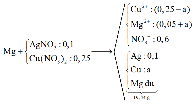 Cho m gam Mg vào dung dịch chứa 0,1 mol AgNO3 và 0,25 mol Cu(NO3)2, sau một thời gian thu được 19,44 gam