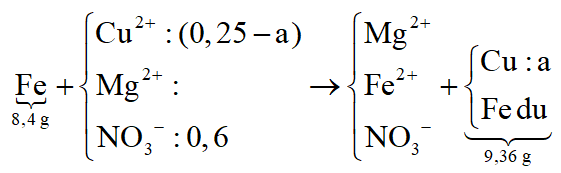 Cho m gam Mg vào dung dịch chứa 0,1 mol AgNO3 và 0,25 mol Cu(NO3)2, sau một thời gian thu được 19,44 gam kết tủa và dung dịch X chứa 2 muối. Tách lấy kết tủa, thêm tiếp 8,4 gam bột sắt vào dung dịch X, sau khi các phản ứng hoàn toàn thu được 9,36 gam kết tủa.Giá trị của m là